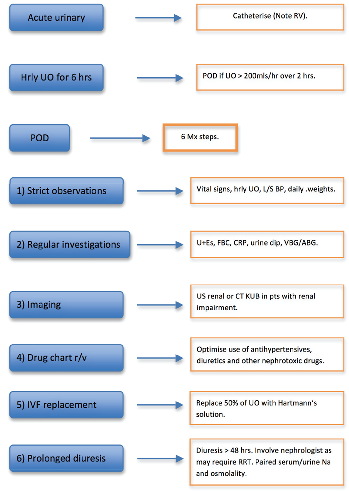 Figure 2: Management algorithm for POD. RV = residual volume. UO = urine output. L/S = lying / standing. U+Es = urea & electrolytes. FBC = full blood count. CRP = C-reactive peptide. VBG/ABG = venous / arterial blood gas. US = ultrasound. IVF = intravenous fluid. NaCl = sodium chloride. RRT = renal replacement therapy.
