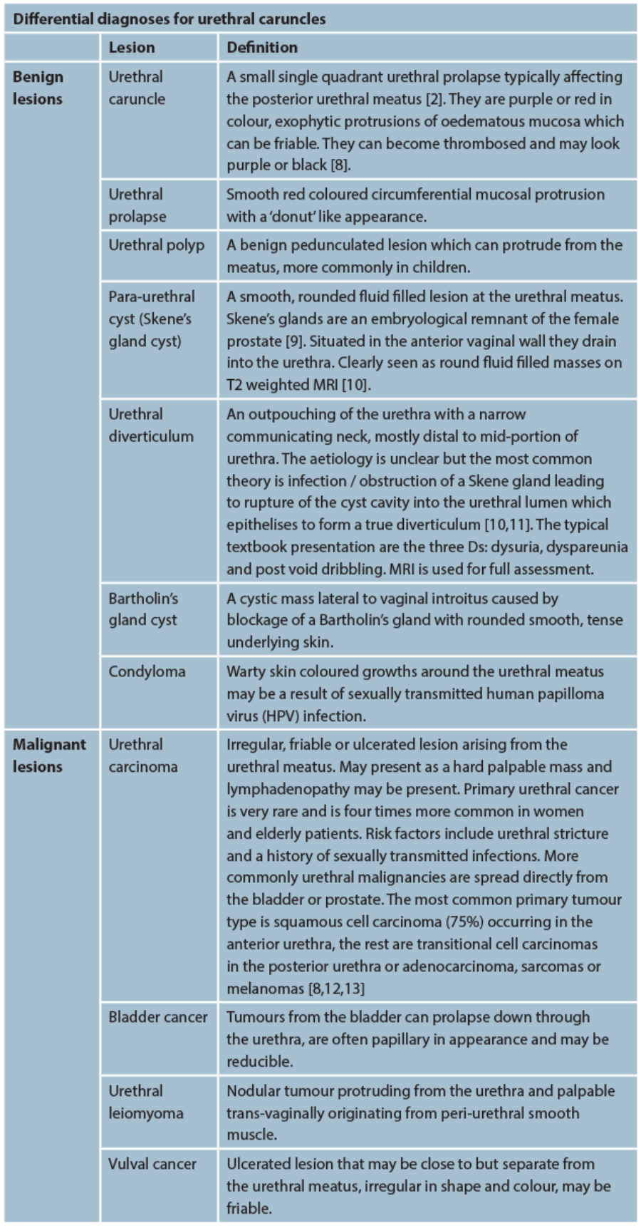 There are multiple potential differential diagnoses for urethral caruncle, many of which look very similar. In the following table we describe the more common or serious lesions and how to differentiate them.