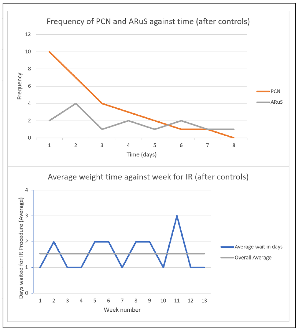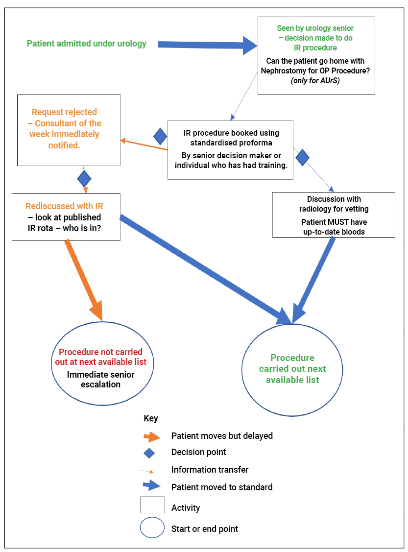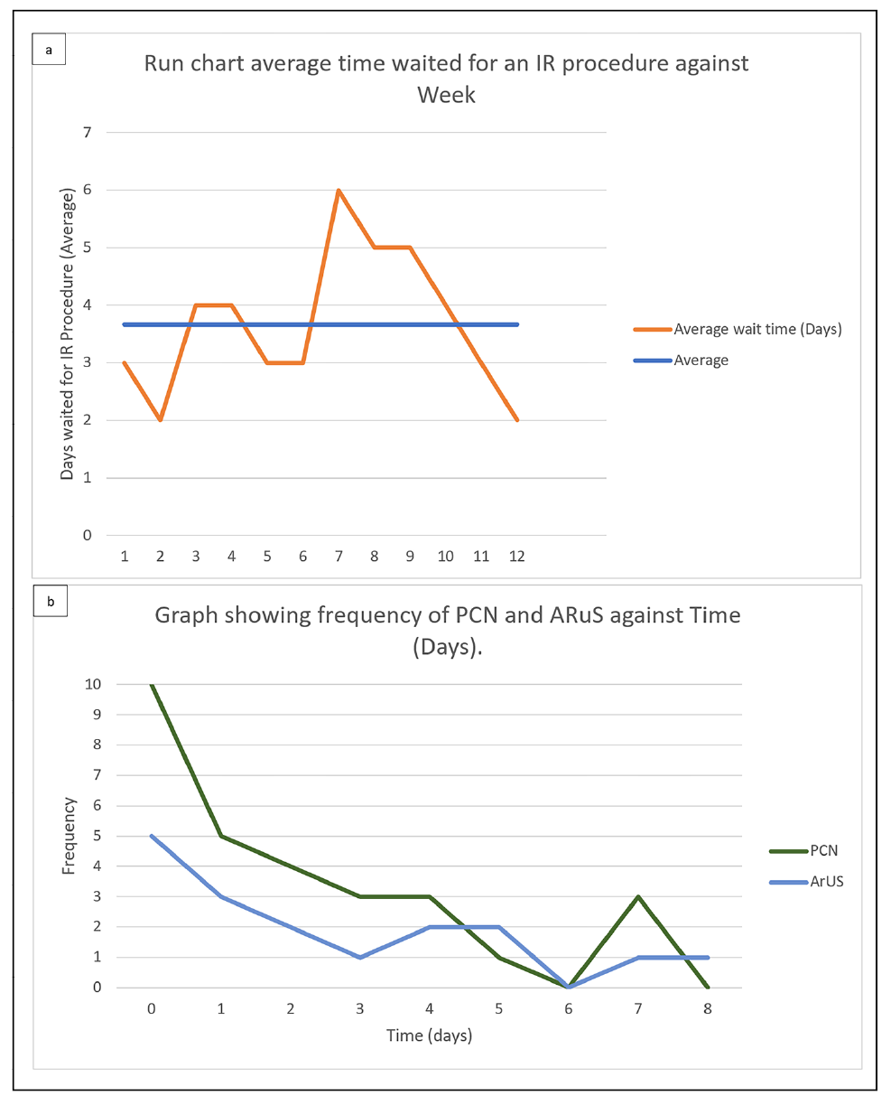 Prior to the intervention, the average wait for IR was 3.66 days. Higher than our set agreed standard of 3.5 days (Figure 3a and b). A systematic analysis of the current state of the system followed data gathering. Thematic analysis outlined lack of standardisation. We noted bottlenecks through mapping which resulted predominately from lack of communication (Figure 1).
