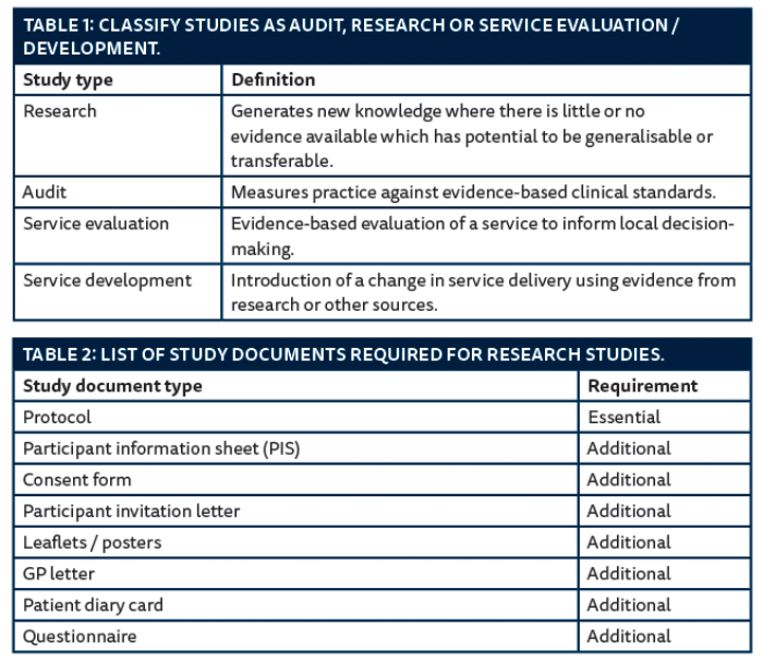 The chief investigator is the individual who takes overall responsibility for the design, conduct and reporting of the study. The principal investigator is responsible for the conduct of research at a specific study site. Table 2 lists common types of study documents required for conducting a research study. The National Research Ethics Service (NRES) has templates for the participant information sheets and consent forms that can be adapted to the needs of the study [4].