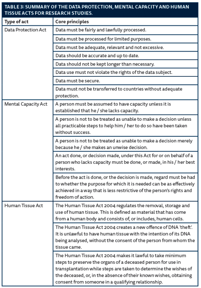Three legislation acts form part of the RGF concerning data protection, mental capacity and human tissue. The three acts are only applicable in England, Wales and Northern Ireland as Scotland has its own legislation, summarised in Table 3. All clinical staff, as well as researchers, must comply with the Data Protection Act [10]. Typical issues to be considered in relation to data include storage, access, transfer, use and identification. Research data should, where possible, be anonymised (i.e. information that could be used to identify a person is removed) before being saved and / or transferred.