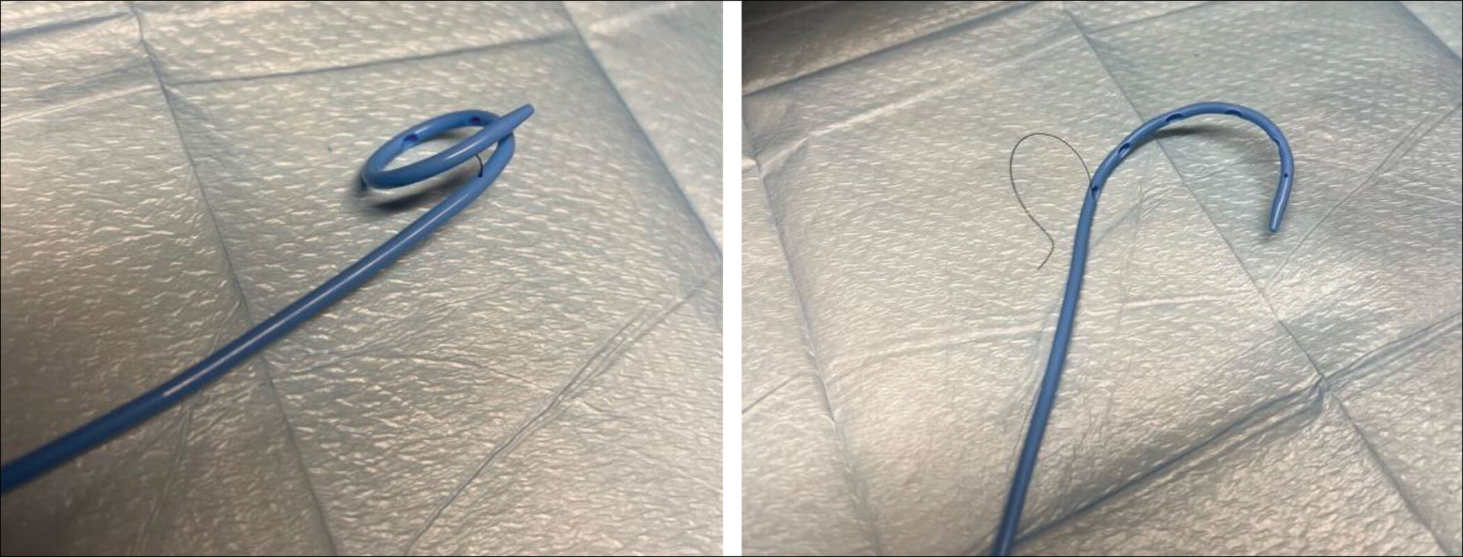 Figure 2: Normal pigtail mechanism (left) and failure allowing uncurling of the coil (right).