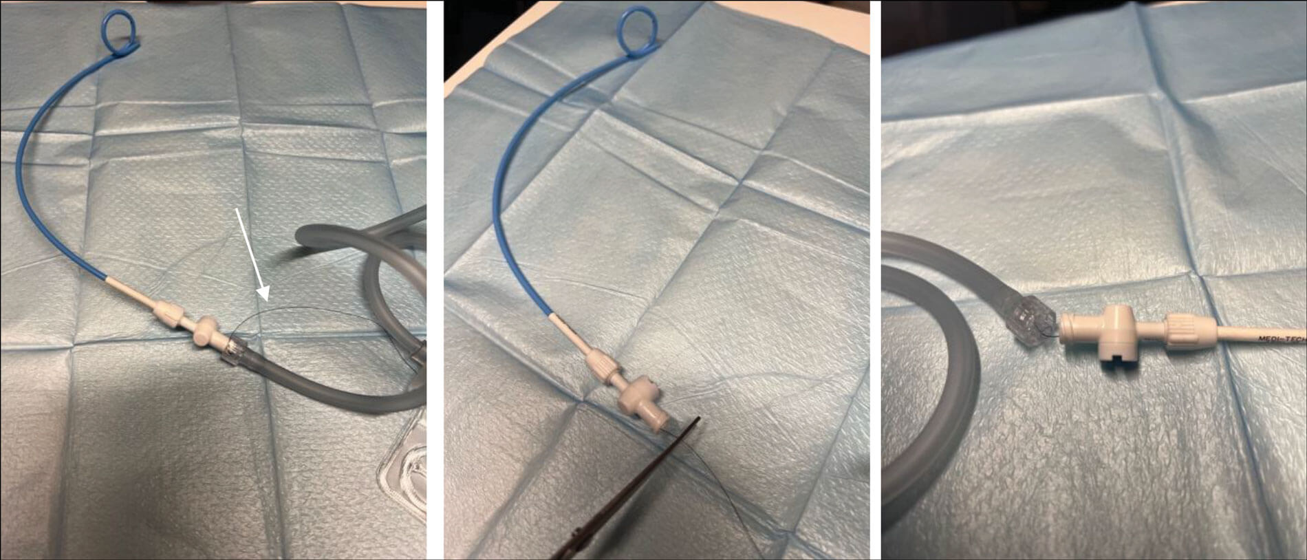 Figure 1: Long pigtail thread sitting outside of the drainage system (marked with white arrow)