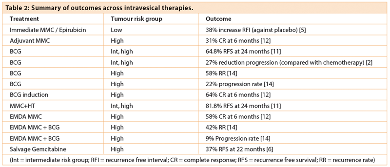 HT has been utilised to improve efficacy of intravesical therapies and has been studied in bladder cancer since the early 1990s. HT alone can improve anti-tumour immunity and have direct cytotoxic effects, and it has been shown to increase cytotoxicity and improve absorption of MMC [10]. There have been a number of delivery systems developed; commonly this is delivered locally via a Foley catheter at temperatures of 41-45oC, but there have been some external delivery systems utilising both chemotherapy and radiotherapy [10]. Local delivery systems have been CE approved for use in Europe for the treatment of NMIBC.