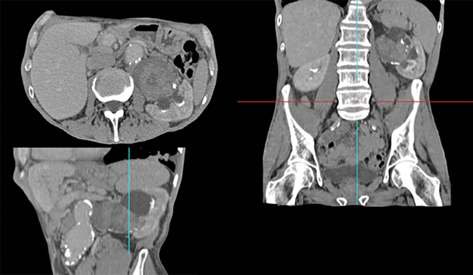 Figure 1: Reconstructed CT scan in urographic phase showing a large UTUC in the renal pelvis. This image also highlights the surgical challenge that can be present in such cases like the associated aortic aneurysm anterior to the UTUC. A reconstructed image is important in planning the treatment.