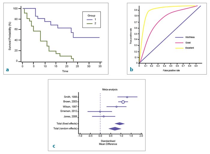 1. What type of curve is seen in image a? What outcome factor is commonly compared?