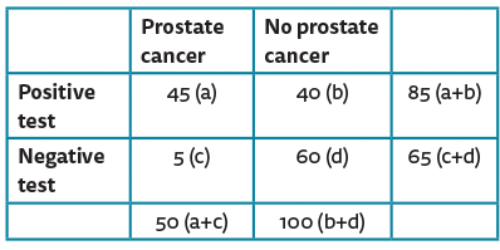 A new diagnostic blood test for prostate cancer has been examined in a clinical trial of 150 patients. The data for its effectiveness in establishing a diagnosis of prostate cancer is shown:
