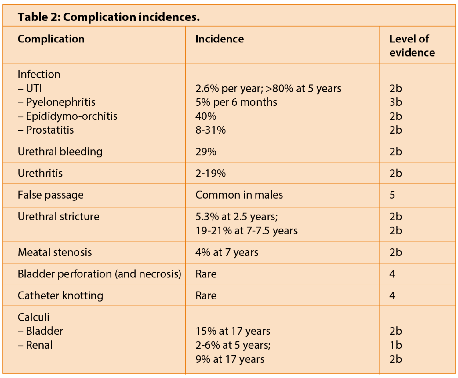 The incidence of urethral stricture disease secondary to CISC increases with duration with prevalence rates ranging from 5% at 2.5 years to approximately 20% at 7 to 12 years [14,16,19]. Urethral stricture formation is associated with both the increased catheterisation rate and the number of years performing CISC; from this it could be inferred that risk of urethral stricture formation increases with overall number of times catheterised [16].