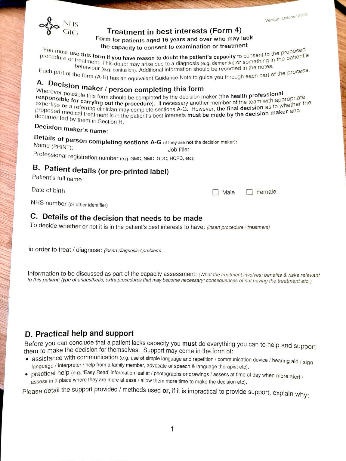 - In this case, a consent form 4 (Figure 1) is required as the patient does not have capacity for this decision.