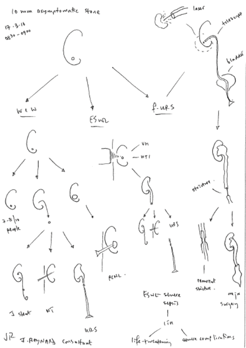 The diagrams I use are known affectionately by Oxford urological trainees as ‘Reynard-o-grams’ (I think it is affection, but maybe it’s ridicule). Their main function is to impart genuine understanding on the part of the patient and their relatives, but they serve another important function, that of providing evidence that an effort was made to impart genuine understanding.