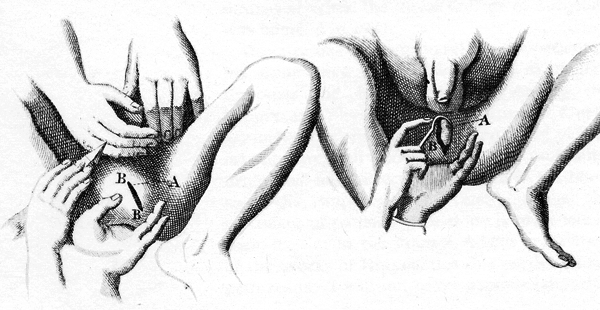 Figure 1: The Celsian method of lithotomy being performed on a boy.