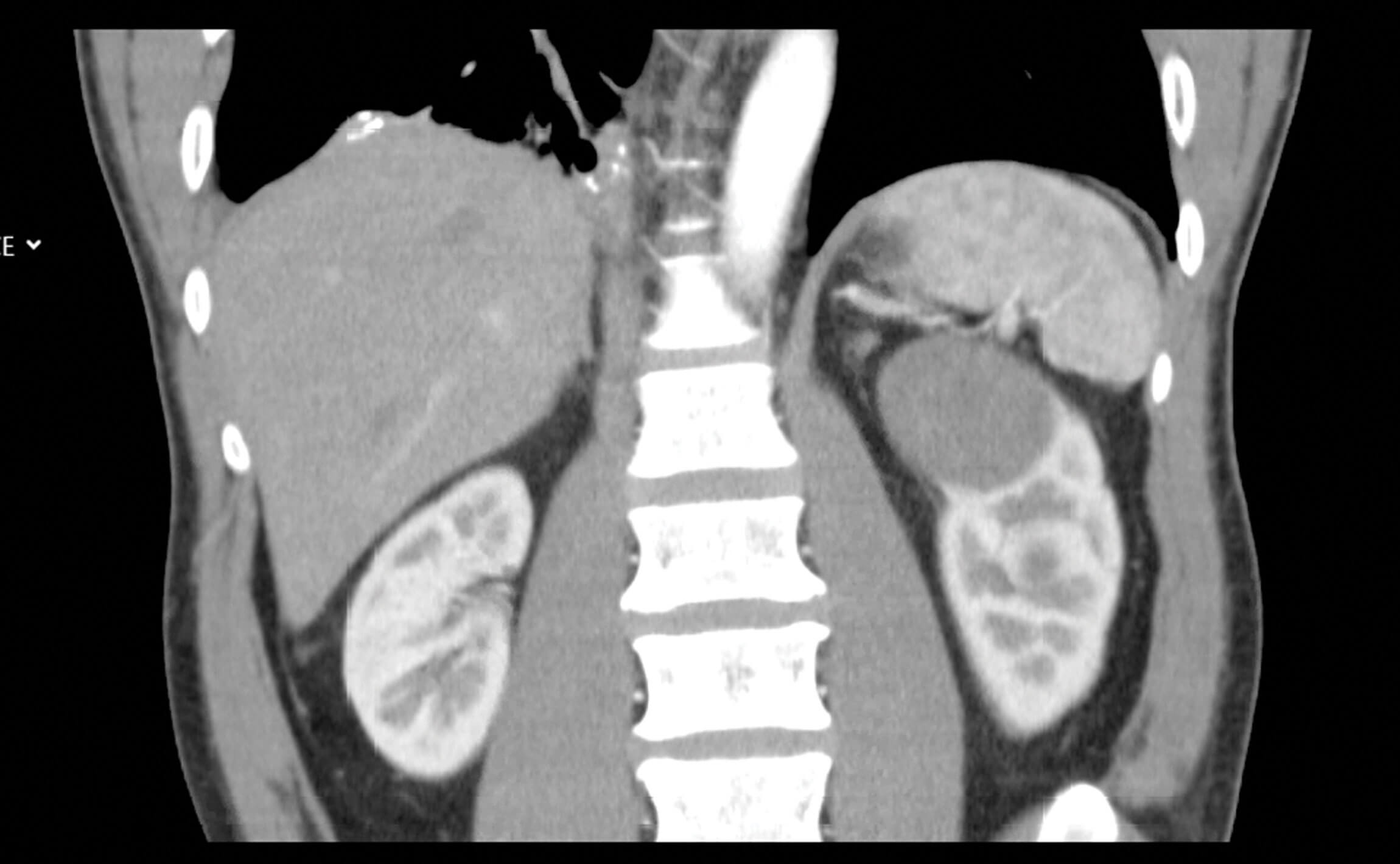 Figure 1: Presenting CT arterial portography of the patient, post contrast coronal,