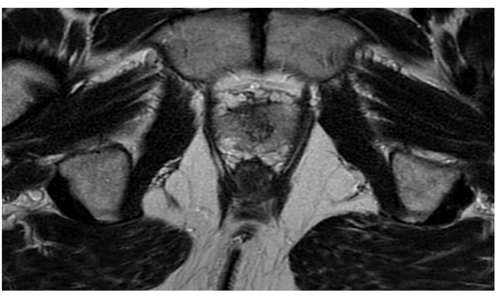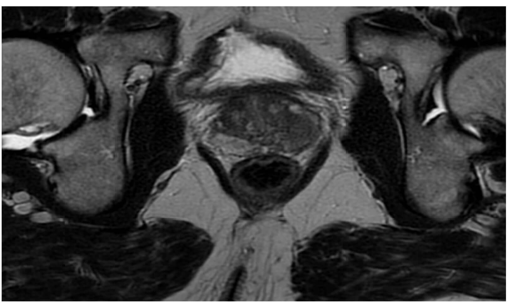 Figure 1a: Pre prostate biopsy MRI pelvis. T2 sequence showing anatomy of the prostate.