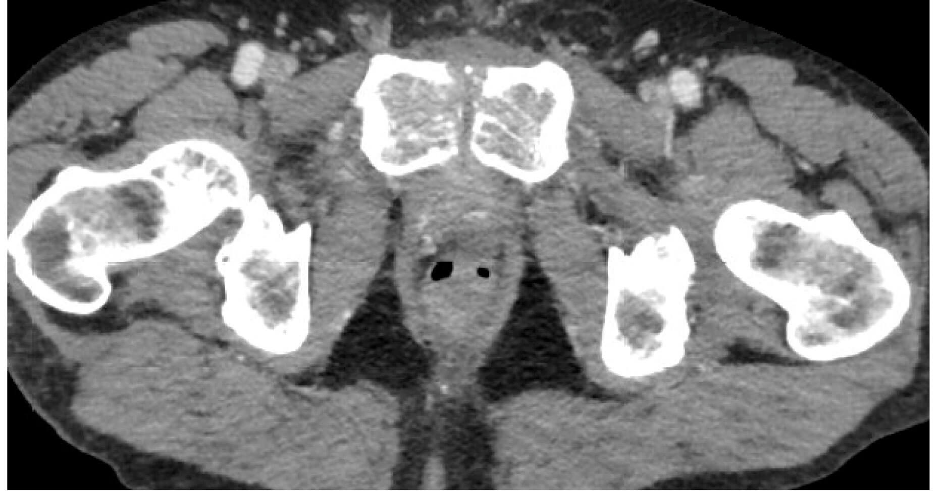 Figure 2a: Post RARP CT image showing loss of articular surfaces of pubic symphysis. No collection.