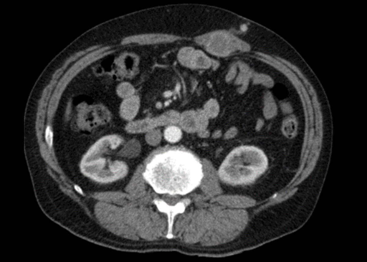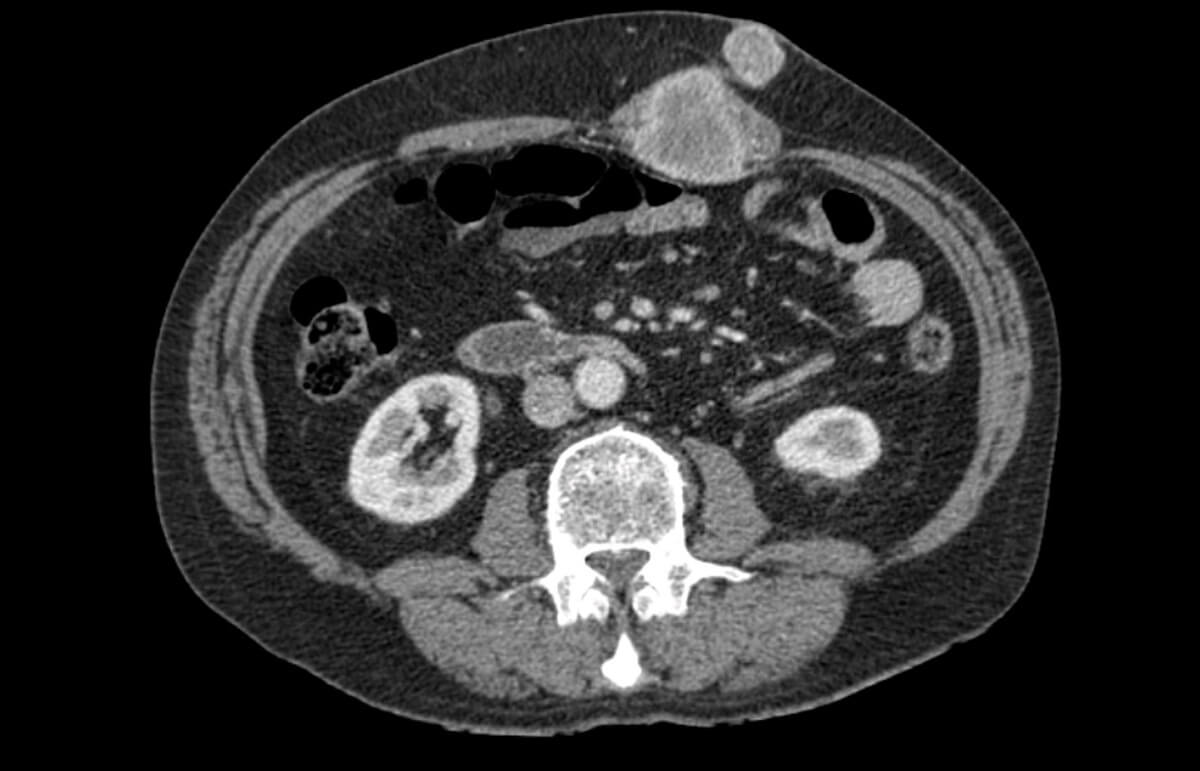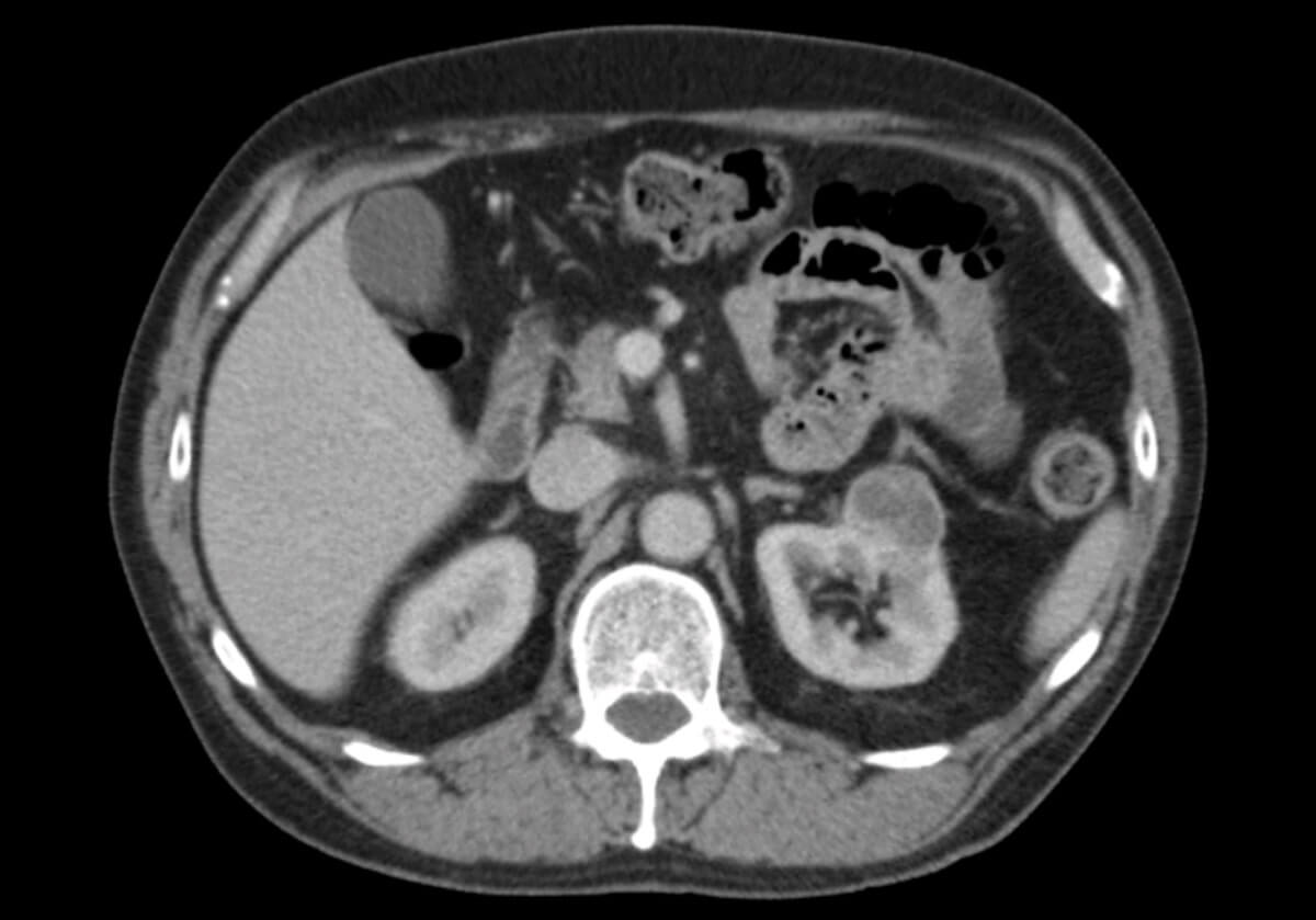 A 65-year-old gentleman was referred to our unit with a history of several months left upper quadrant pain and a CT scan demonstrating a 3.6cm enhancing cystic mass of the left kidney alongside a small left adrenal mass (Figure 1). He had a background of ischaemic heart disease, hypercholesterolemia, and hypertension.