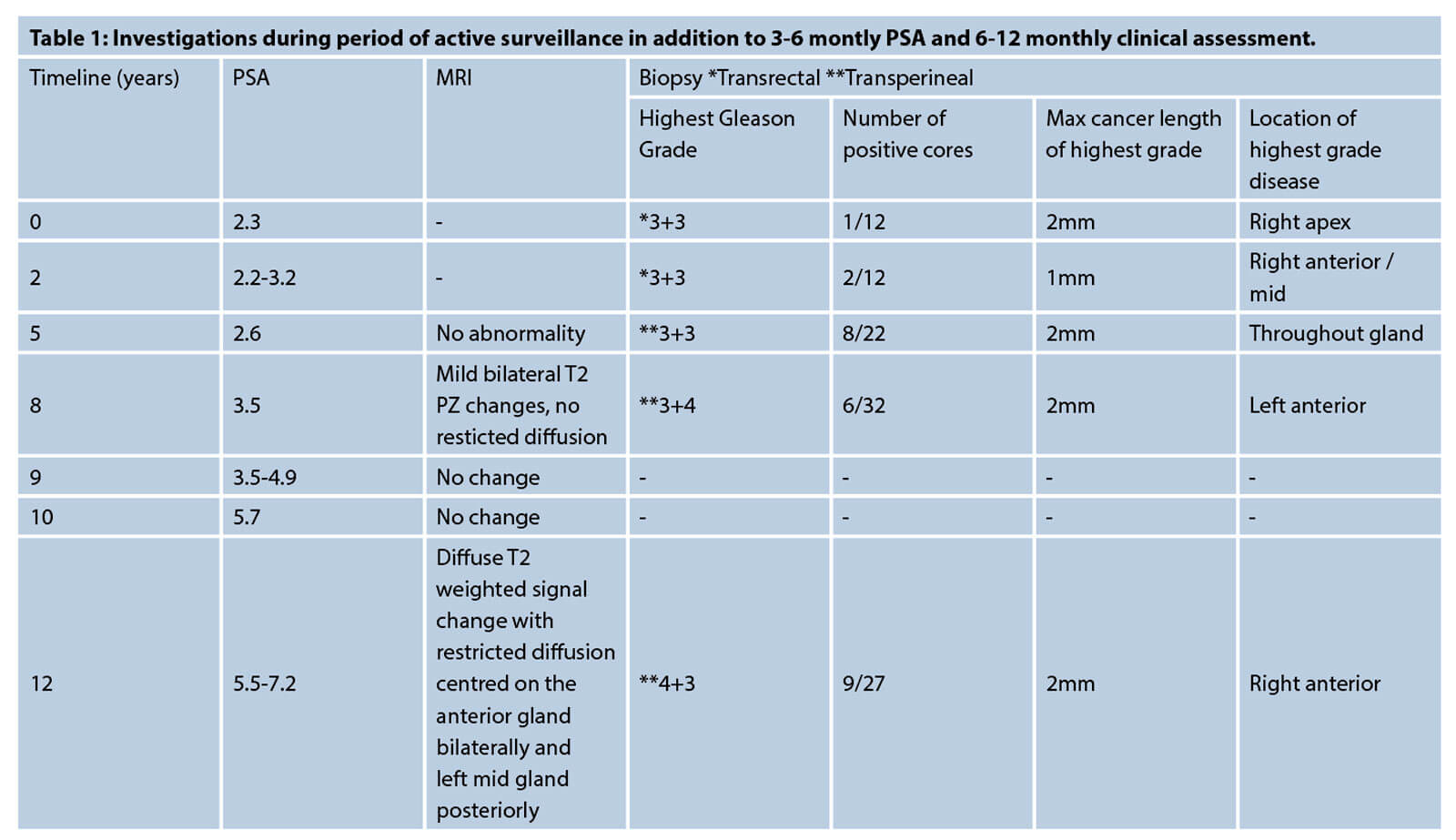 Systematic transrectal prostate (TRUS) biopsies showed a focus of Gleason 3+3=6 adenocarcinoma in one core from the right apex occupying 15% of the submitted tissue and high-grade PIN in another single core from the right base. He had no other medical co-morbidities and after counselling a decision was made for initial management with active surveillance. The patient underwent PSA checks every three to six months with a clinical review every six to twelve months, in addition to the investigations outlined in Table 1.
