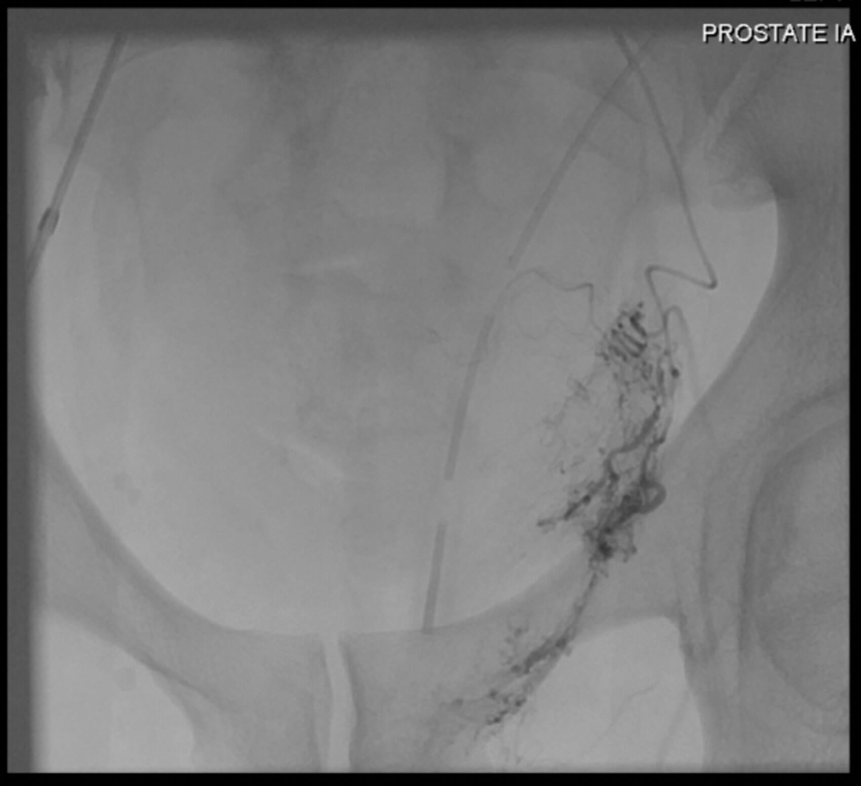 The patient underwent robot-assisted radical prostatectomy with a request for bilateral nerve sparing. The operation was very challenging due to fibrotic posterior planes and difficulty in nerve sparing and apical dissection with an estimated blood loss of 300mls. His recovery was complicated by a postoperative bleed causing a pelvic haematoma requiring transfusion and super-selective embolisation of the residual left prostatic artery (Grade III complication, Clavien-Dindo classification) as demonstrated in Figures 2 and 3. The patient experienced transient stress urinary incontinence postoperatively and poor erectile function requiring PDE5 inhibitors and vacuum pump device.
