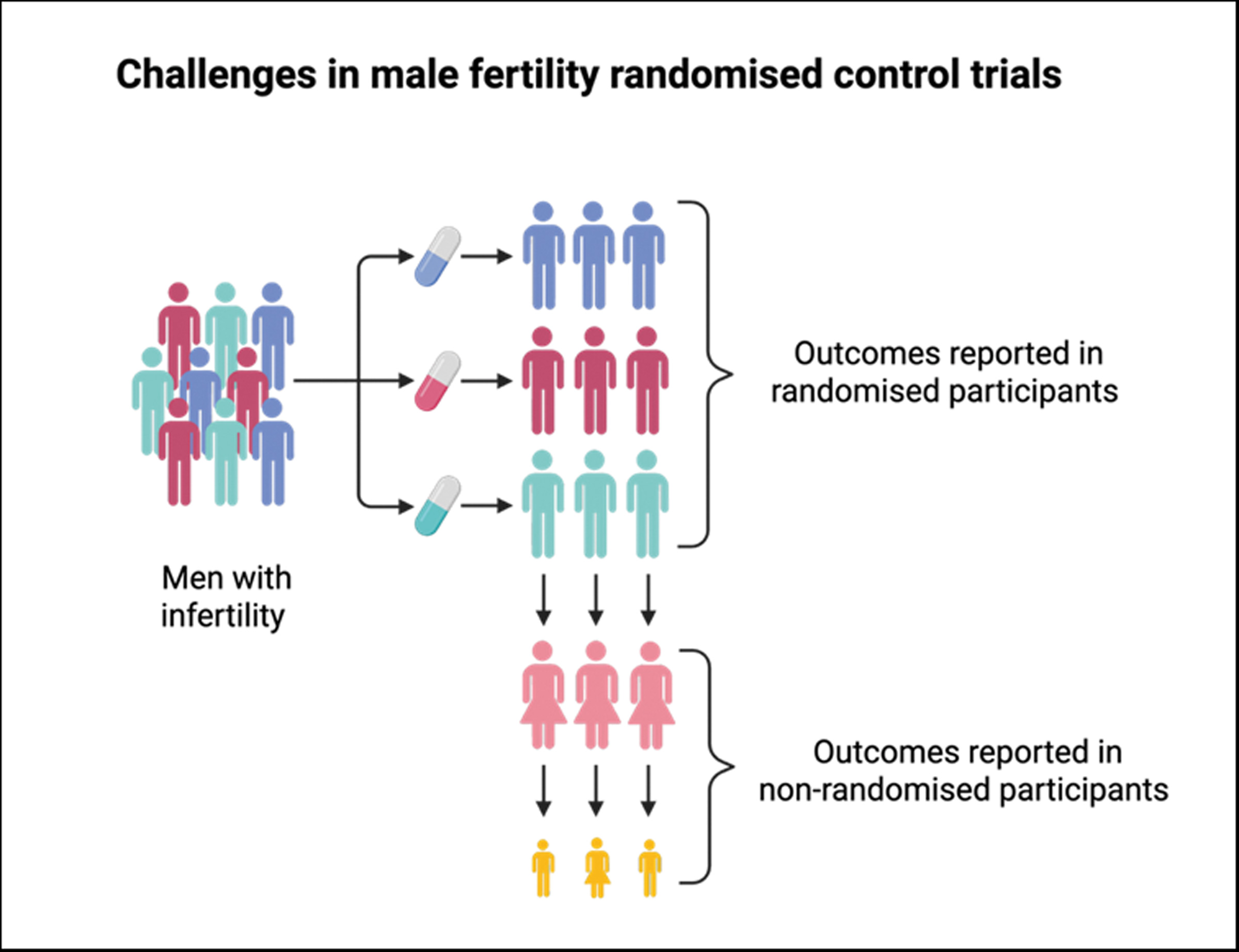 Figure 1: Overview of the challenges in outcome reporting in male fertility randomised control trials, including outcomes in non-randomised participants, influenced by external factors such as aneuploid pregnancy loss.