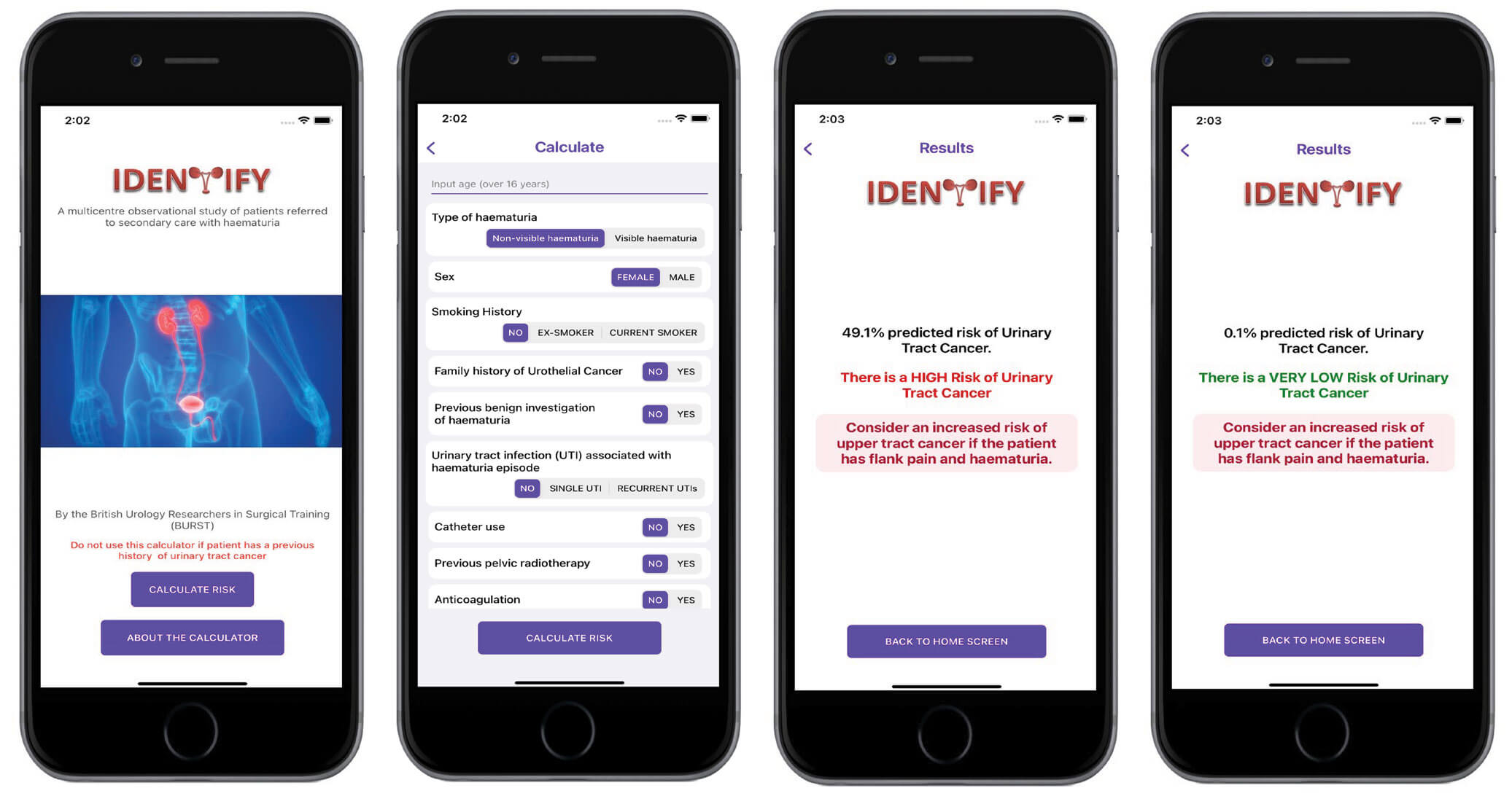 Another important consideration of prediction tools is their usability. In today’s digital age an accurate computerised online tool is far more practical to use. So, we have added the IDENTIFY risk calculator to our website and made it into an app on Apple and Android. Finally, an integral step in prediction models is external validation. This is important to show that the model is generalisable and works in a different population from which it was developed. We have undergone this process in a separate cohort of 3500 patients referred with haematuria to secondary care, and preliminary results show good performance of the model in predicting cancer in the validation cohort. The final results will be published soon.