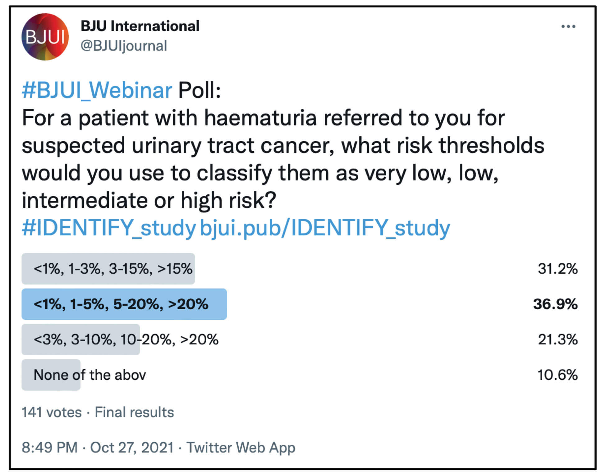 So how can this risk calculator be used? The clinician can use a patient’s percentage risk to discuss with them their risk and what investigations they may want as a result. As a guide however, we created risk categories based on clinical judgement and recommended that less than 1% is very low risk, low risk is 1 to 5%, medium is 5 to 20%, and over 20% is high risk. This was also supported by a BJUI twitter poll undertaken by urologists.
