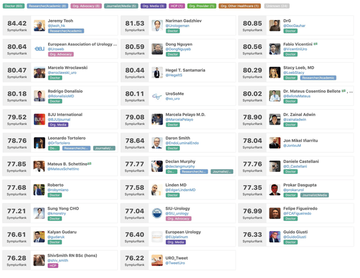 On 9 April 2019, we performed a search in Symplur (www.symplur.com/), a social media analytics platform for healthcare. This search included data from 15 December 2018 to 8 April 2019. During this time period, the hashtag, #UroSoMe, was used a total of 14,883 times. A total of 10,079 retweets has been recorded. The #UroSoMe community is still expanding, and up until 8 April 2019, a total of 2262 Twitter users has been using this hashtag. These numbers have yielded a total of 21,178,622 impressions. Most discussions were initiated by Jeremy (@jteoh_hk) and the #UroSoMe working group as shown in the network analysis in Figure 1. The top influencers are shown in Figure 2. Recently, #UroSoMe had the greatest honour to receive the Innovation Award at the 7th BJUI Social Media Awards (2019), which took place in Barcelona during the 34th Annual European Association of Urology Congress [5].