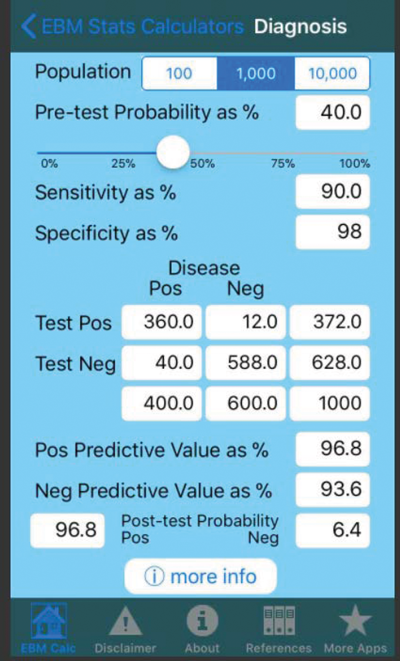 EBM Stats Calc was developed by Dr Josh Steinberg, a physician who has developed a number of apps that make it possible to consult evidence-based resources at the point of care. In addition to its value as a resource for medical decision-making, Dr Steinberg has correctly pointed out the potential value of EBM Stats Calc as an educational resource. For example, educators can demonstrate the impact of pre-test probability on the overall usefulness of a test: students can use the slider tool to adjust the pre-test probability and then watch to see the impact of those adjustments on the calculated values. Users can also click on ‘more info’ to access detailed information about the calculations available in each section of the app.