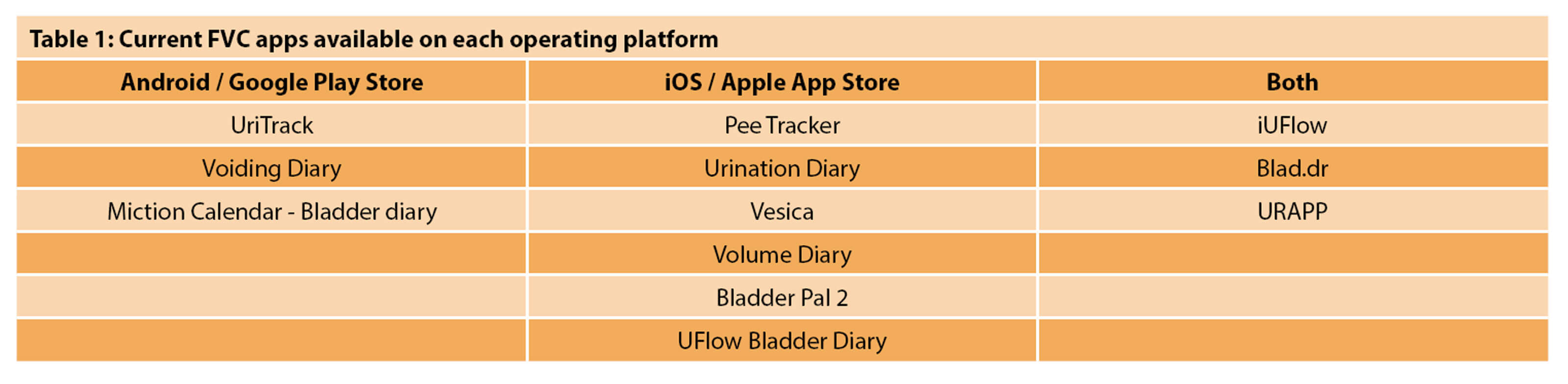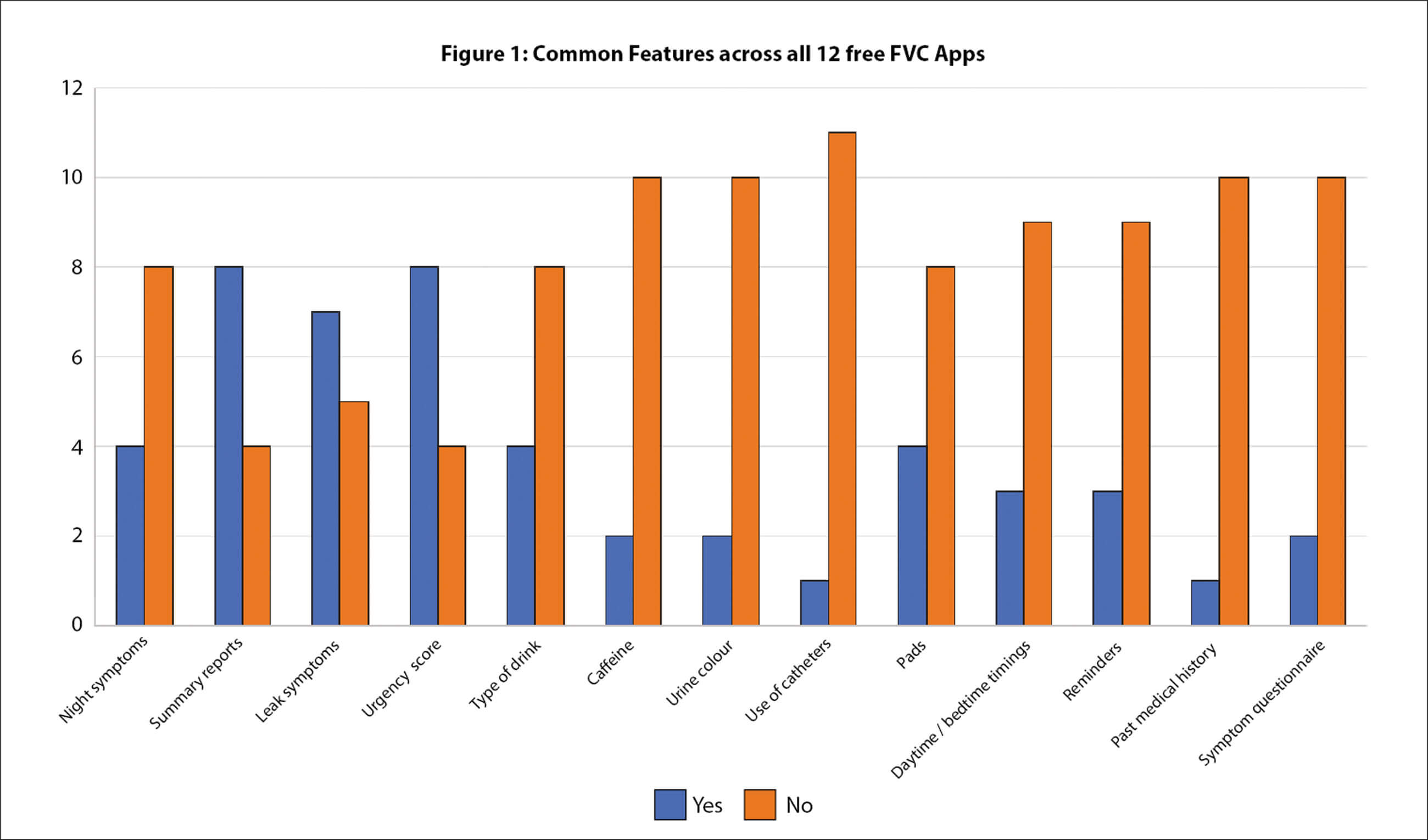 We identified 15 FVC apps across both platforms at the point of our search. One (UroBladderDiary®) was not free for users and two apps (DBD Elartos CT20® and Where I Go+®) required access codes for login and were excluded. Of the remaining 12, six (50%) were iPhone exclusive, three (25%) Android exclusive and another three (25%) available on both platforms (Table 1). All apps were ad-free, although Pee Tracker® required payment for customisable features including summary reports.