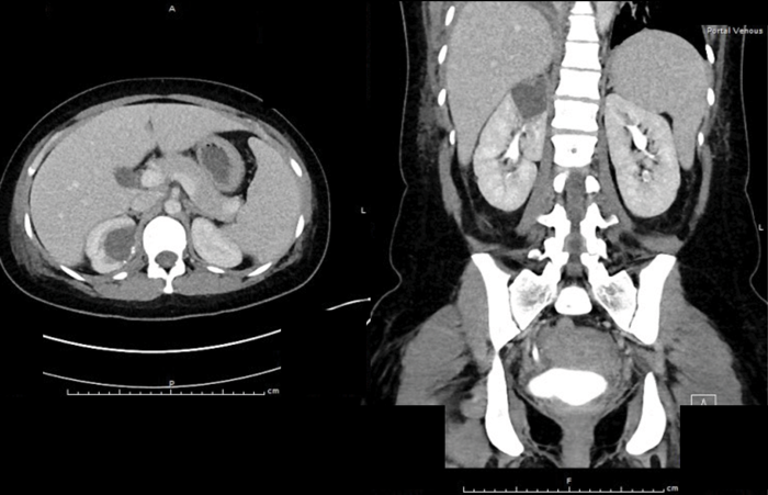 A 34-year-old lady is referred from the medics with right-sided loin pain and urosepsis. An initial ultrasound scan was arranged, followed by a subsequent CT scan. These scans did not show any renal / ureteric stone, but selected images are shown to the left.