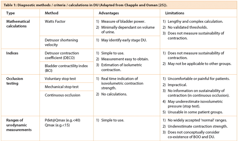 Pressure flow studies are the only accepted method of diagnosing DU. There are however no widely agreed upon diagnostic criteria; most relate to the strength of detrusor contraction rather than other aspects, such as contraction speed or sustainability, which may also be important.