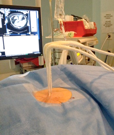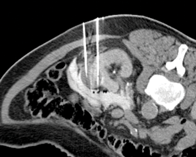Once the probes are appropriately positioned it may be necessary to protect vulnerable adjacent structures, such as the bowel, pancreas or ureter. The adjunctive techniques most commonly employed to achieve this protection involve the injection of fluid (hydrodissection) or gas (air dissection) to displace at risk structures (Figure 3).