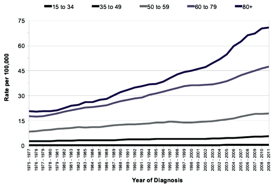 Figure 1: Age-standardised incidence rates per 100,000 population, by age.