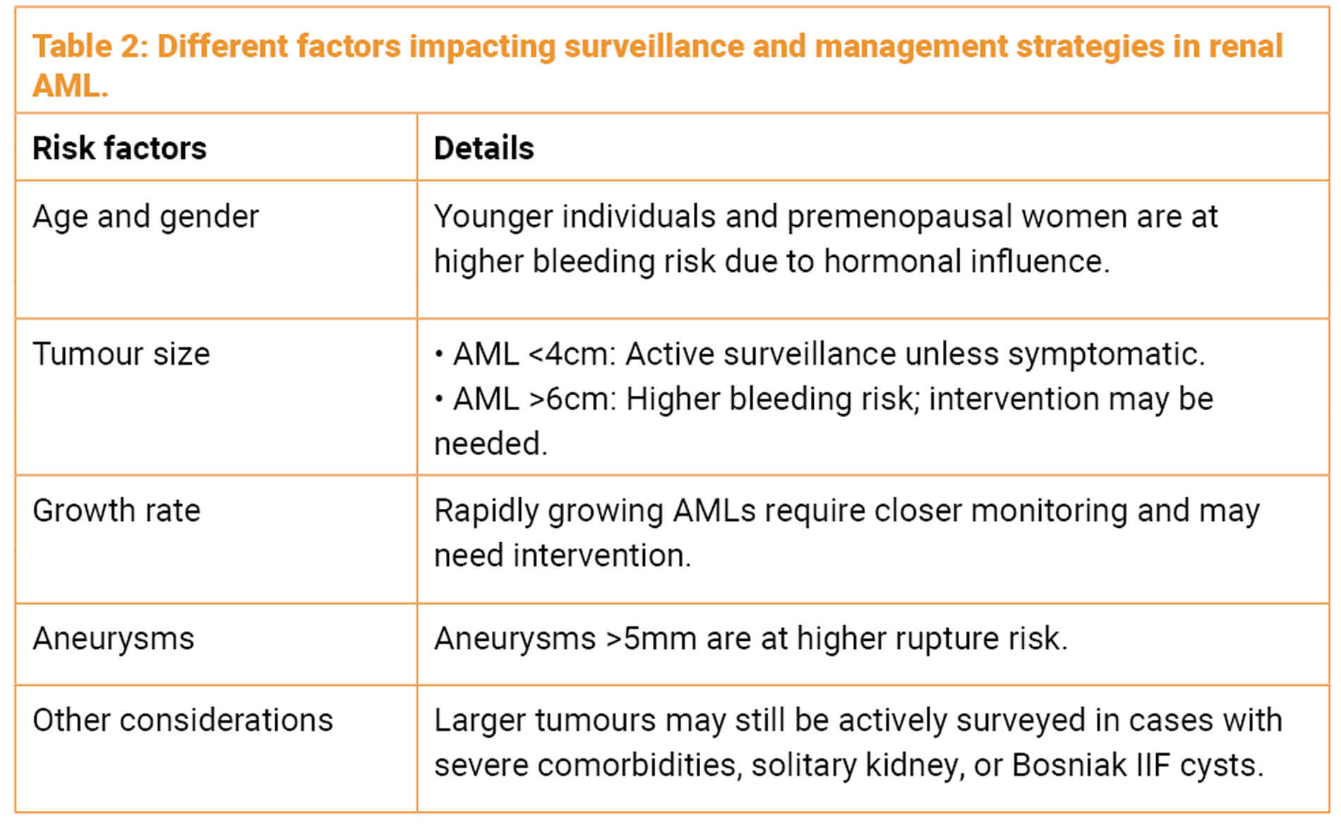 As the size of tumour increases, so does the risk of bleeding and symptoms. Most studies state that AML less than 4cm can be actively surveyed unless symptomatic. However, this previous 4cm cut-off has recently been challenged as a risk factor for bleeding, as it has led to the overtreatment of many asymptomatic AMLs. Some studies have concluded that the increased risk of bleeding is more pronounced in lesions exceeding 6cm rather than 4cm [9]. Larger tumours could also be considered for AS in cases of severe patient comorbidity, solitary kidney, or the presence of Bosniak IIF cysts.
