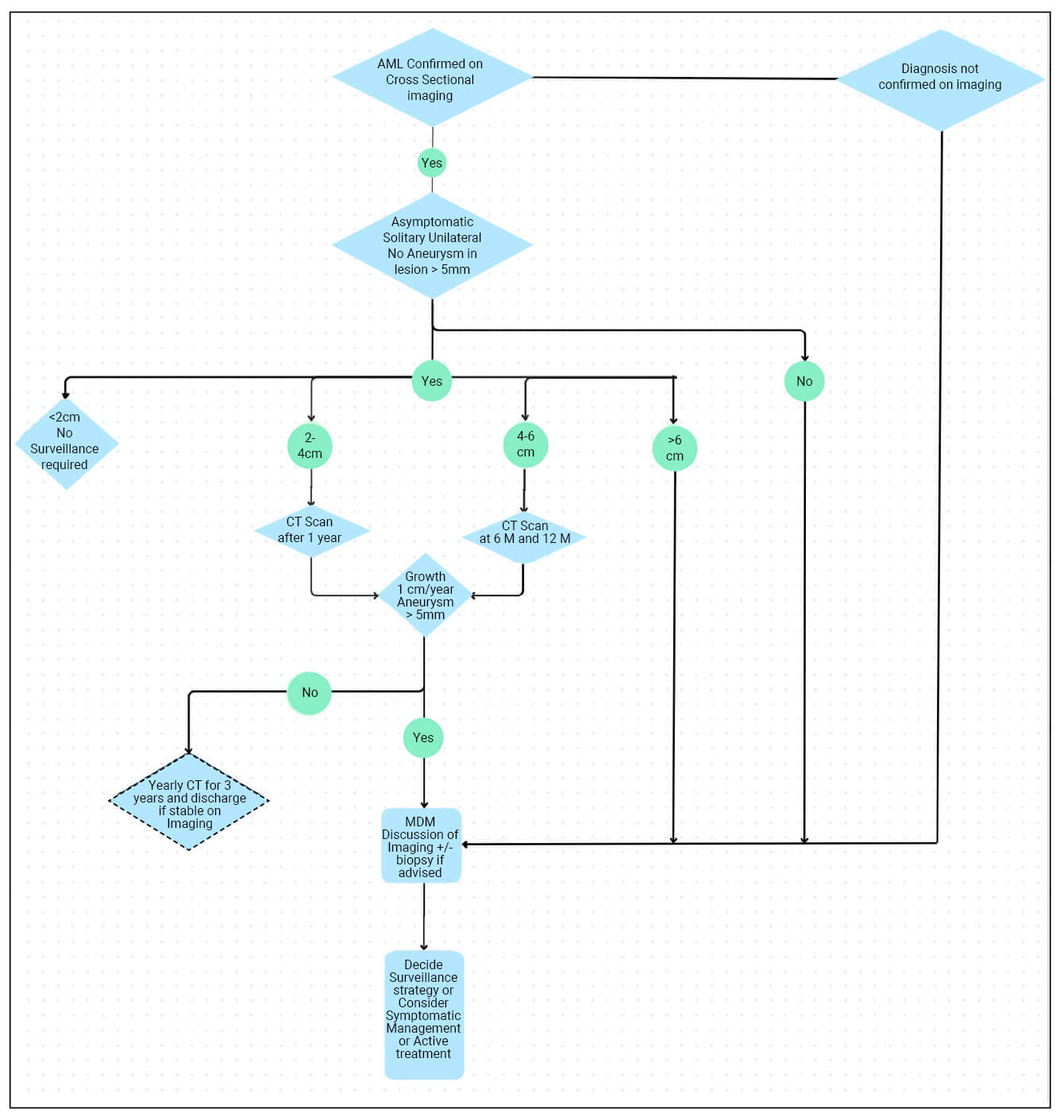 According to Chan et al., most sporadic AMLs, particularly those under 40mm, do not grow significantly and rarely pose a threat. Their study recommends different surveillance strategies based on tumour size. Their practice was to perform a US scan five-yearly for AMLs 21-29mm and a two-yearly US for 30-39mm tumours [12]. Maclean et al. examined the growth rate of small solitary AMLs under 20mm and concluded that this subgroup do not require follow-up due to their slow growth rate [13]. Ouzaid et al. mentioned that their AS protocol consisted of imaging at 6-12-month intervals, followed by annual follow-up visits, including a physical examination and CT imaging [14]. Dorin et al. reported a retrospective case series where patient follow-ups occurred at 6-12-month intervals using CT, MRI, or US. AMLs <4cm in diameter were considered for annual surveillance [15].