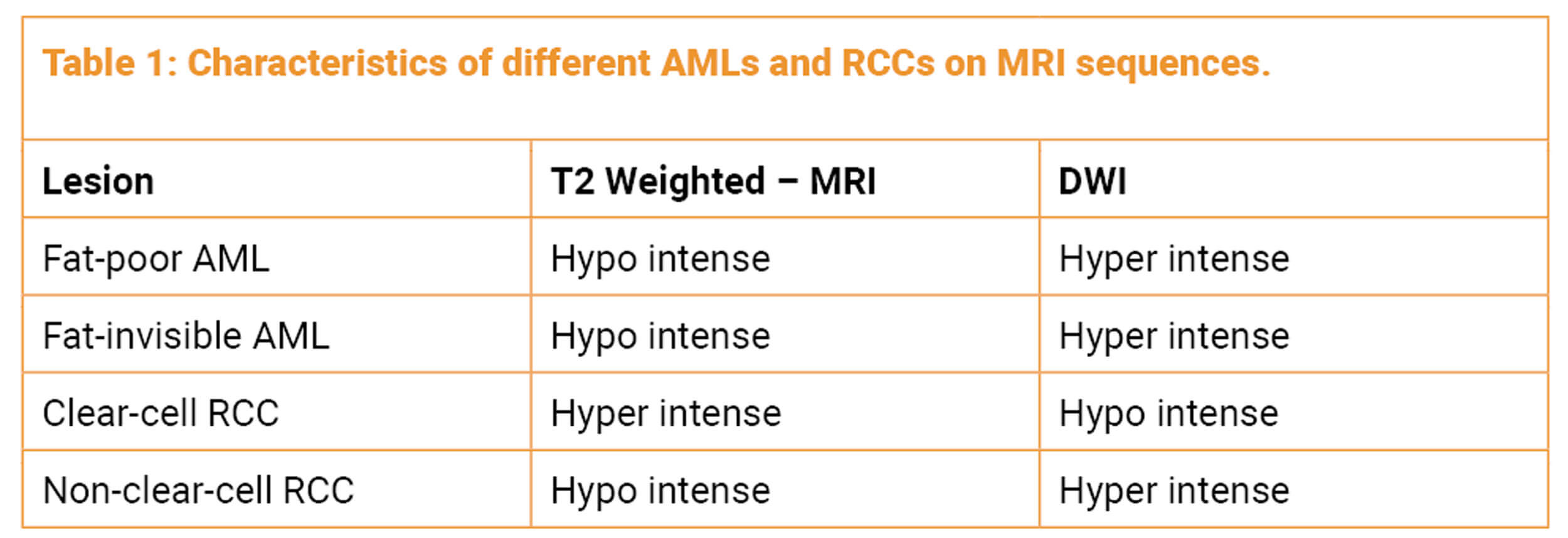 On T2-weighted images, fat-rich AMLs appear hyperintense due to their fatty tissue, while fat-poor AMLs are hypo intense compared to the renal parenchyma. It is even more challenging to differentiate fat-invisible AML from RCC as they completely lack adipose tissue and resemble renal parenchyma. Clear-cell RCC is hyper intense on T2, while fat-poor AMLs are hypo intense. However, both fat-invisible AMLs and non-clear-cell RCCs are homogeneously hypointense on T2-weighted images.