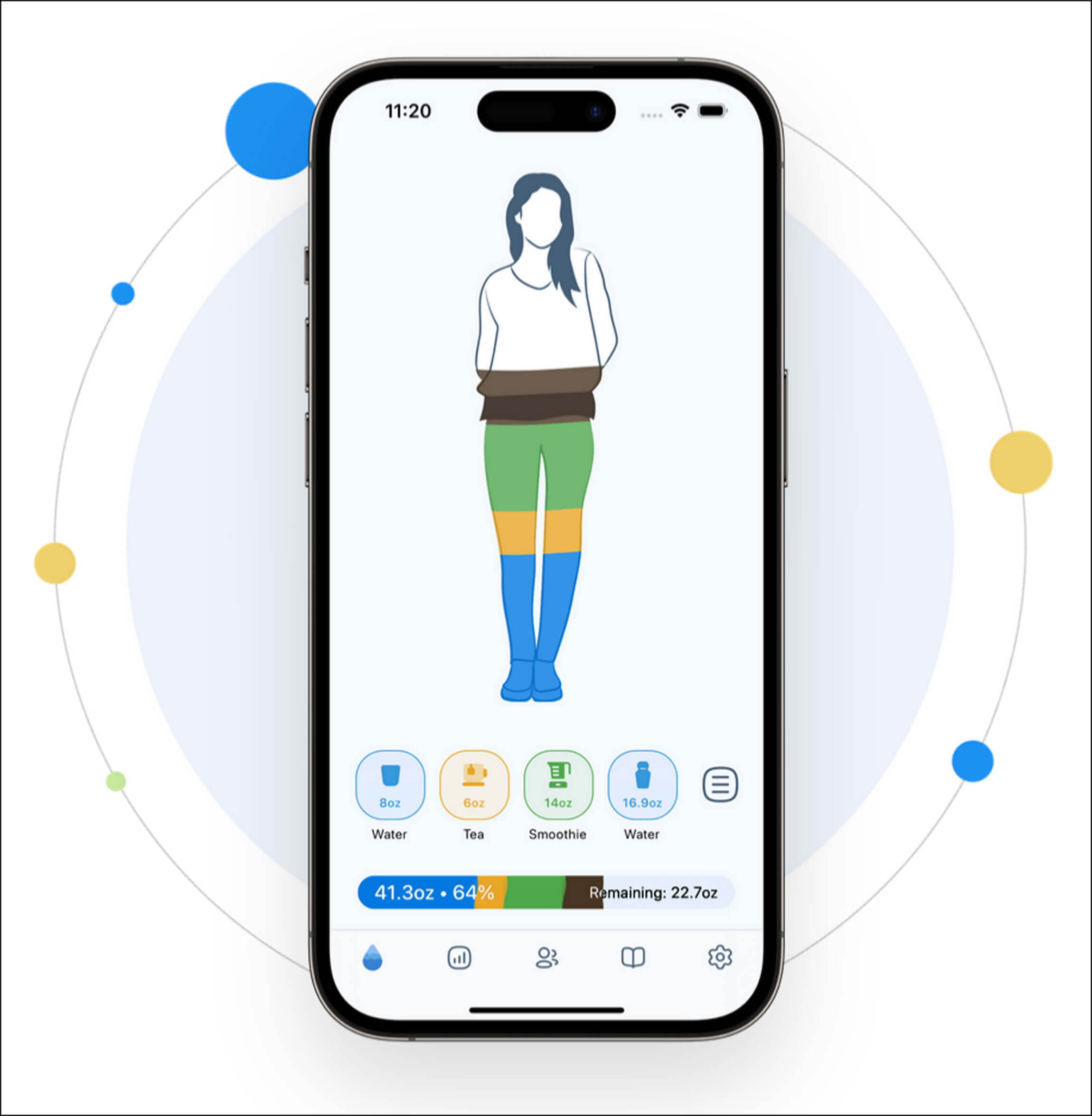 - Tracking of water intake (some apps include types of drink and various container sizes)