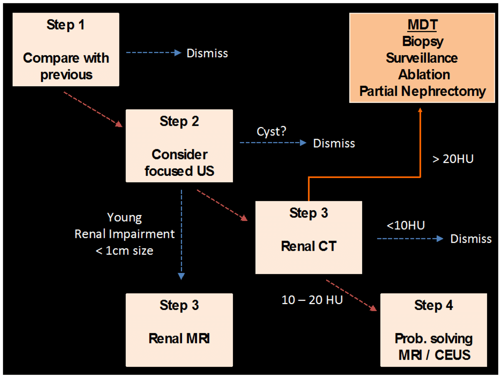 Small indeterminate renal lesions on conventional abdominal CT (portal venous phase) should be carefully compared to previous available imaging or undergo further imaging characterisation with focused ultrasound, multi-phase renal CT or contrast-enhanced MRI as proposed in Figure 11.