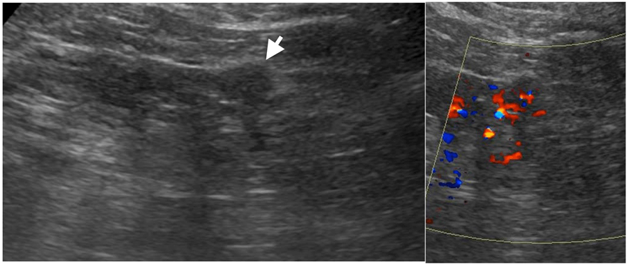 Internal vascularity demonstrated on colour Doppler (right).