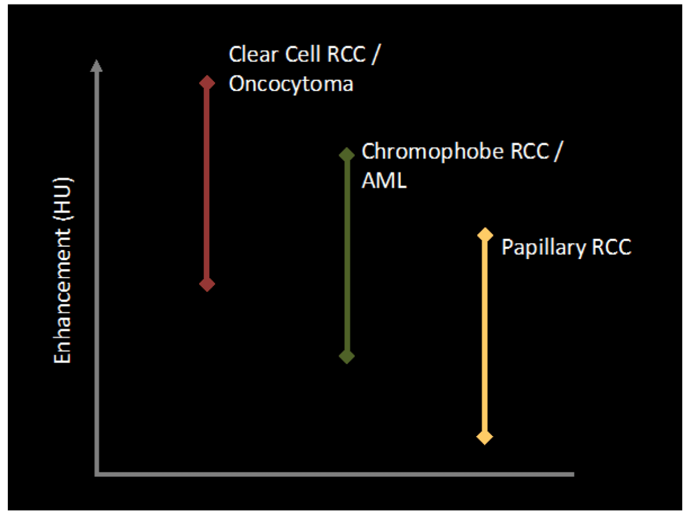 On multi-phase CT, a contrast enhancement gradient of ≥20HU signifies solid vascularised tissue compatible with a primary renal lesion. Benign lesions also demonstrate variable contrast enhancement and represent up to 20% of resected lesions <4cm.