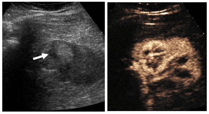 Contrast enhanced ultrasound (CEUS) with microbubble injection is an emerging tool in small renal mass characterisation and serves to identify abnormal vascularity. Although CEUS cannot differentiate malignant from benign renal masses, for instance RCC from oncocytoma, CEUS can reliably differentiate simple cystic lesions from solid vascularised lesions (Figure 4) [6]. CEUS is particularly useful for assessing septal vascularity within complex cystic lesions and problem solving in cases where CT / MRI assessment of small renal lesions proves indeterminate.