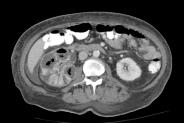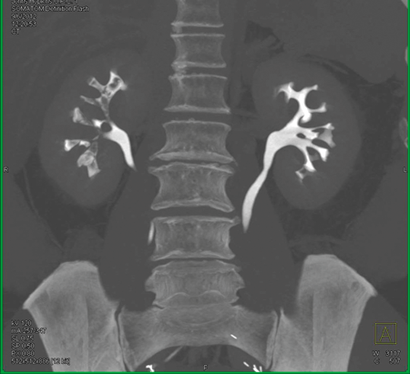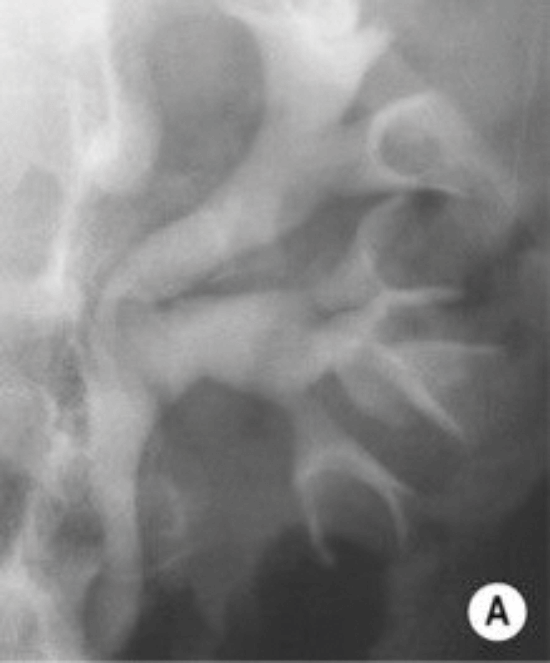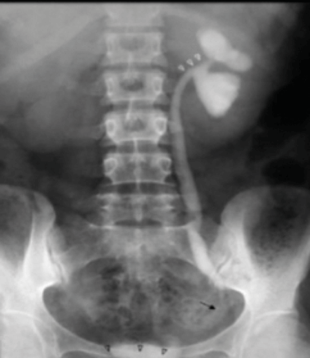 - Figure 2 shows other radiological features of one of these possible causes. What is the likely diagnosis? How often does this condition affect the urinary tract?