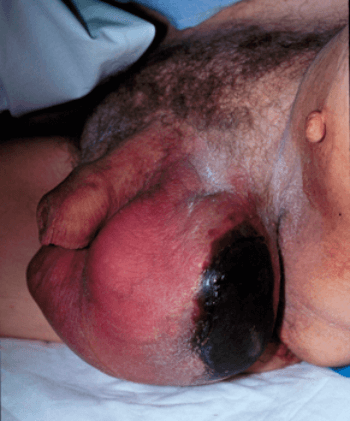You review a man in the Emergency Department with scrotal pain and sepsis. His clinical examination findings are shown.