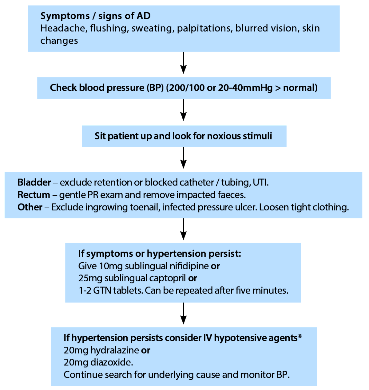 A high index of suspicion is vital if the diagnosis is to be made in a timely fashion. Management comprises recognition, identification and removal of the noxious stimulus, followed by a period of monitoring until the symptoms and blood pressure normalise (Figure 2).