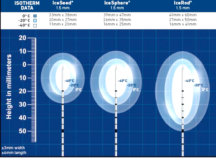 Cryotherapy utilises the Joules-Thompson effect, where a change in temperature occurs when a pressurised gas is passed through a narrow aperture. Older systems used liquid nitrogen, however, due to difficulties in controlling the temperature, argon is now the established cryogen allowing temperatures to reach as low as -186oC. As cell death occurs during both the freezing and thawing cycles, helium is used as the warming gas. Newer technology exists where the need for helium has been replaced by a thermal element inside the needles which can aid in the thawing process.