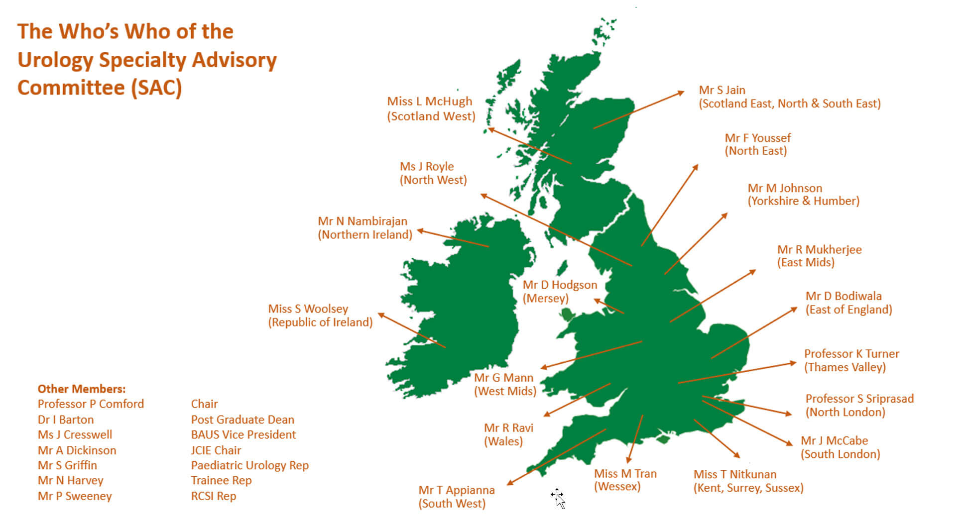 The remainder of the committee is made up of various other interest groups. For example, the British Association of Urological Surgeons (BAUS) Vice President, Jo Cresswell, sits on the Urology SAC as well as a dedicated paediatric urology representative. It is also mandated that every SAC must include a trainee representative.