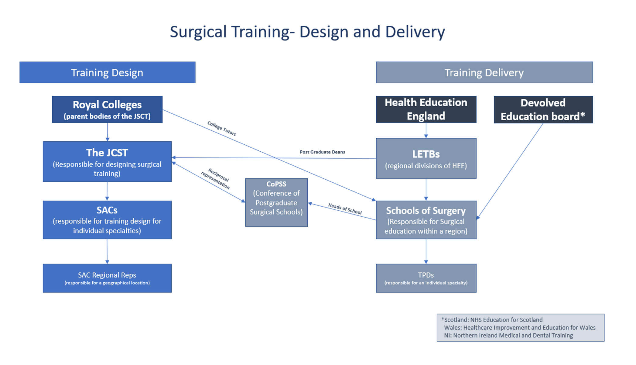 The LETBs themselves are further subdivided in ‘schools’ of each specialty. For those outside of England, schools of surgery exist for each of the devolved nations but as there are no LETBs, they report directly to their health education board.
