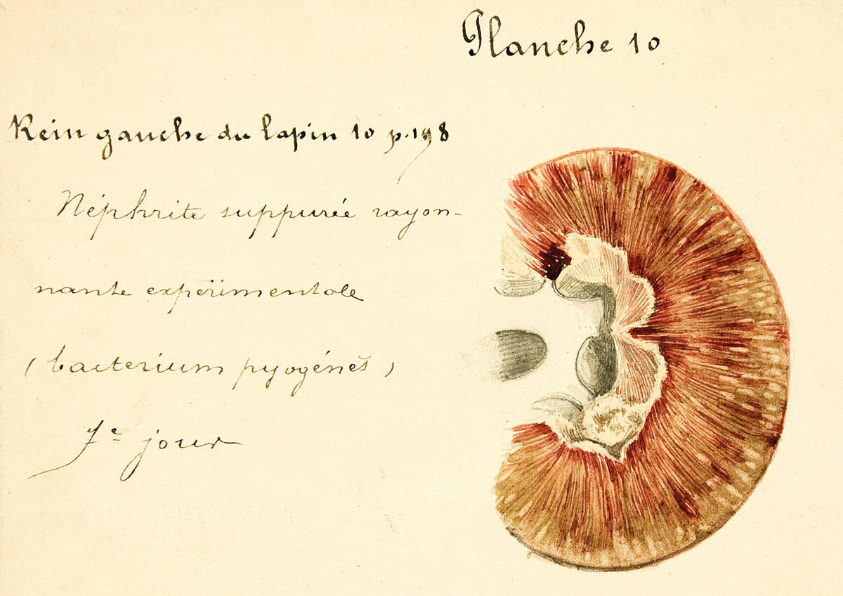 After several prizes and recognitions, he entered the service of Professor Jean-Casimir-Felix Guyon (1831-1920) as a fourth-year internship in 1888. This patron initiated a close relation with his exceptional pupil, who became doctor for a second time in Paris with his thesis ‘Étude sur le rein des urinaires’ in which he discovered the pyogenic germ (later named E. coli) that caused pyelonephritis and death in so many postoperative patients. This anatomic and clinical work was based on autopsy findings and the experimental demonstration of the ascending infection, and included watercolours made by himself to illustrate it (Figure 2).