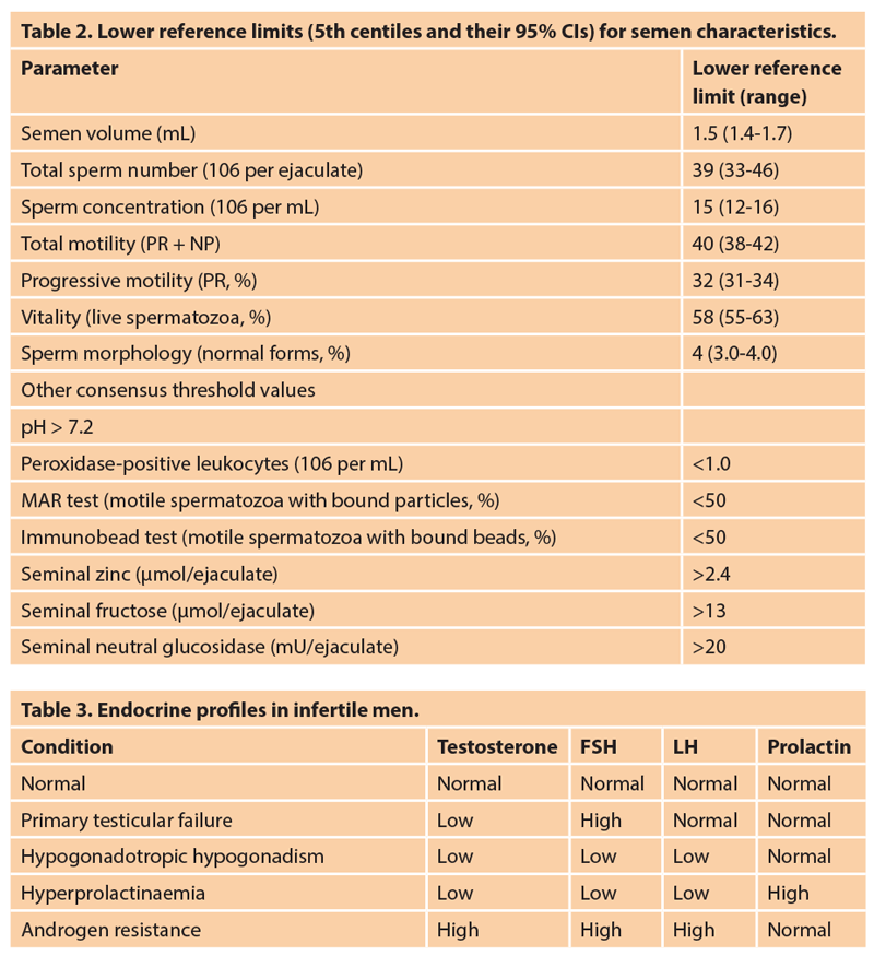 - Semen analysis: specimens should be collected over a period of a few weeks after two to five days of sexual abstinence. The specimen should be delivered within one hour to the laboratory. The normal values for semen parameters are shown in Table 2.