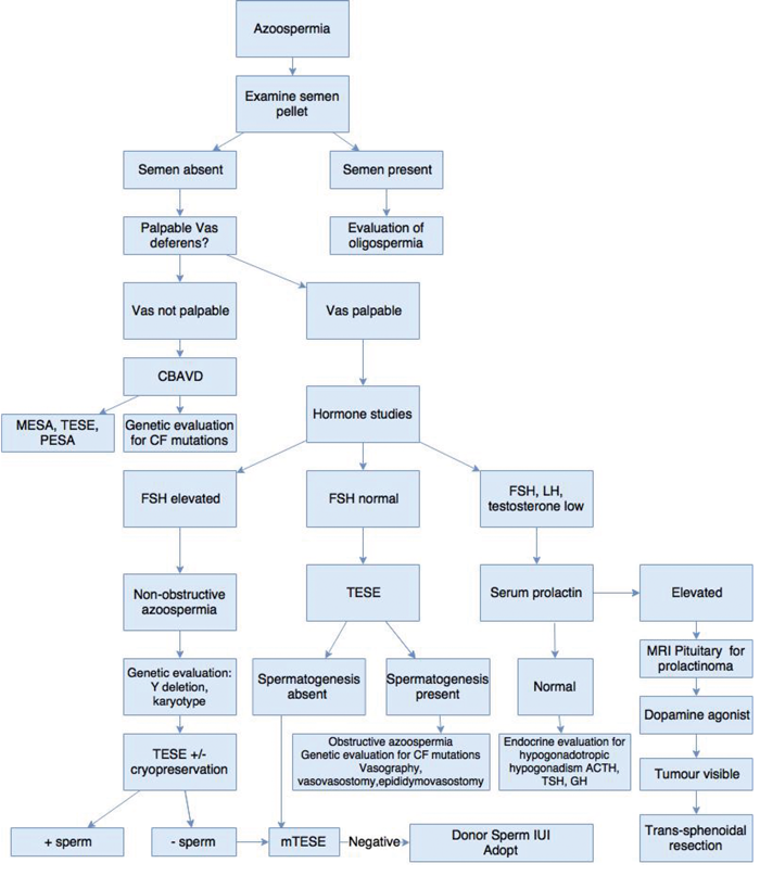 Varicocoelectomy has been the subject of much debate. Surgical varicocoelectomy of clinical varicoceles has been shown to result in a significant improvement of semen parameters [9-11], although subclinical varicocoeles remain a matter for debate [12]. It has been postulated that there is also a significant risk of over treatment of adolescents with varicocoeles [13]. Figure 2 illustrates the algorithm for evaluation and treatment of azoospermia.