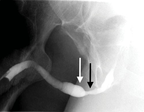 A persistent stricture is identified in the bulbous urethra (black arrow) with proximal dilatation (white arrow).