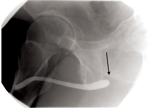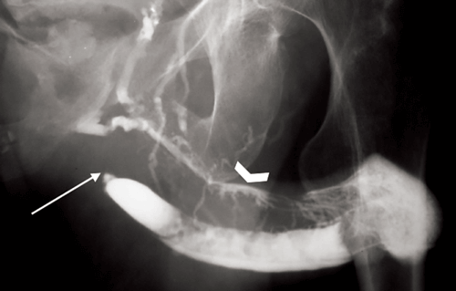 Figure 5: Oblique urethrogram demonstrating a urethral stricture (arrow) and contrast intravasation